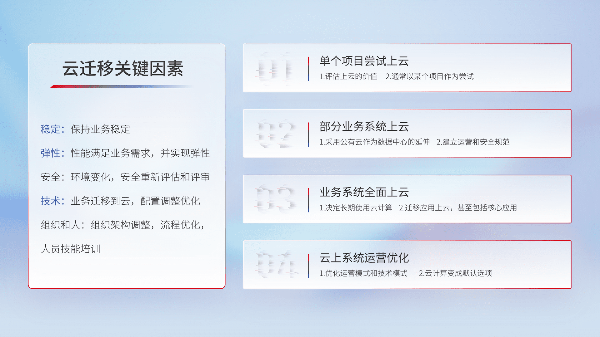 结合实际业务,,,,从规划设计、、、云平台选型、、、云原生改造、、数据迁移、、集成交付,,迁移全过程为客户识别最佳上云路径,,,,做好风险识别管理,,,,设计网络架构、、、身份权限、、、、安全审计合规、、、、操作审计、、、日志审计、、、监控告警策略、、、、多站点容灾设计等,,,对云上基础设施进行整体规划,,,提升IT治理水平,,,以满足弹性、、、、高可用、、高性能的需求。。。