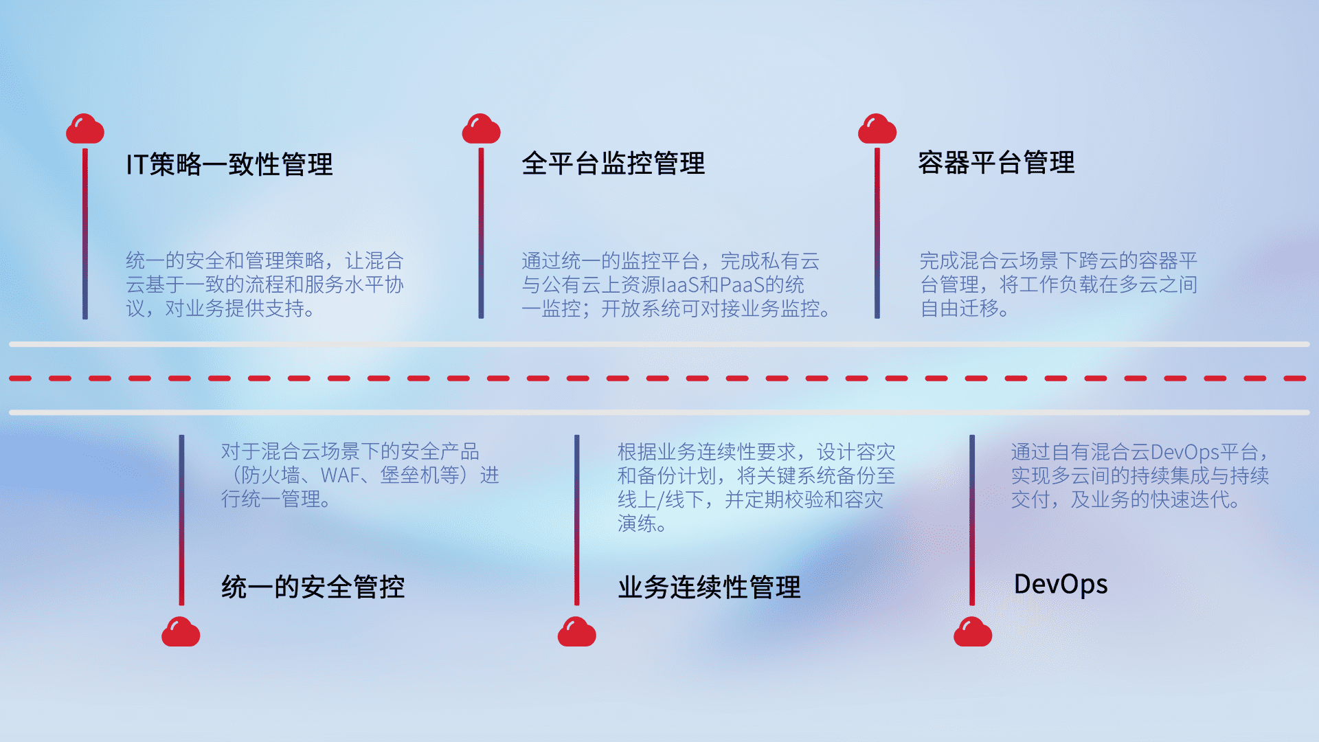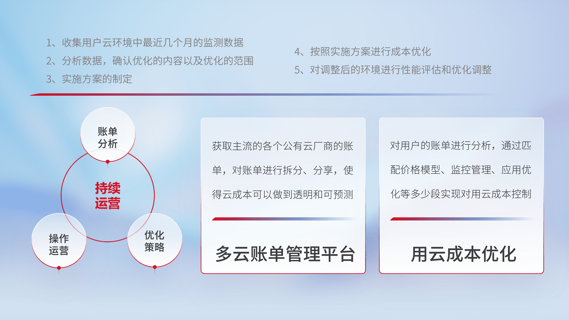 通过多云纳管,,以统一的资源数据模型把客户的云资源进行抽象和封装,,进而实现对多云资源的统一操作,,保障云资源管理的可靠性、、、稳定性与可用性。。量身定制化运维内容,,,,配置、、、开发运维、、、、补丁管理、、、、备份、、、监控、、、、认证和访问管理、、、、审计和日常巡检等,,,保障在用云过程中的可靠度,,,稳定度以及高可用率。。。。