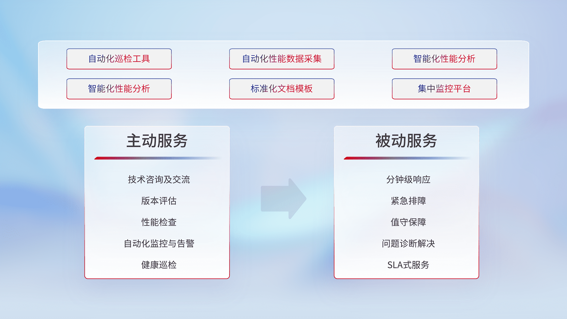 智能化工具和标准化文档,,保障服务质量,,,提供主动服务(包含技术咨询、、、版本评估、、、性能检查、、自动化监控与告警、、、、健康巡检)和被动服务包含(分钟级响应、、、、紧急排障、、值守保障、、、问题诊断解决、、、SLA服务)。。。。