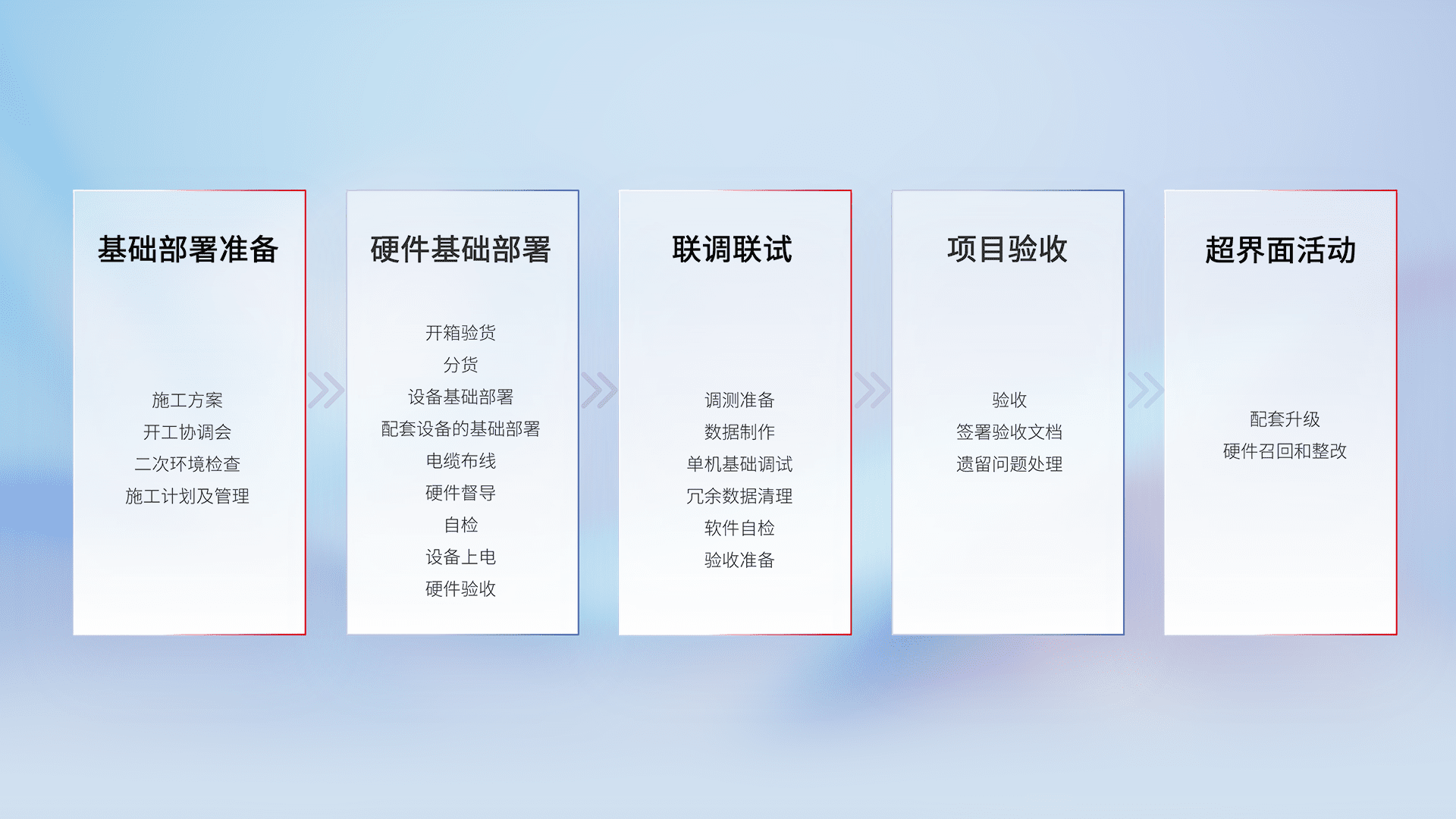从基础部署准备、、、硬件基础部署、、、、联调联试、、、项目验收、、、、越界面活动的全过程可追溯,,,,保证施工质量和进度。。。。