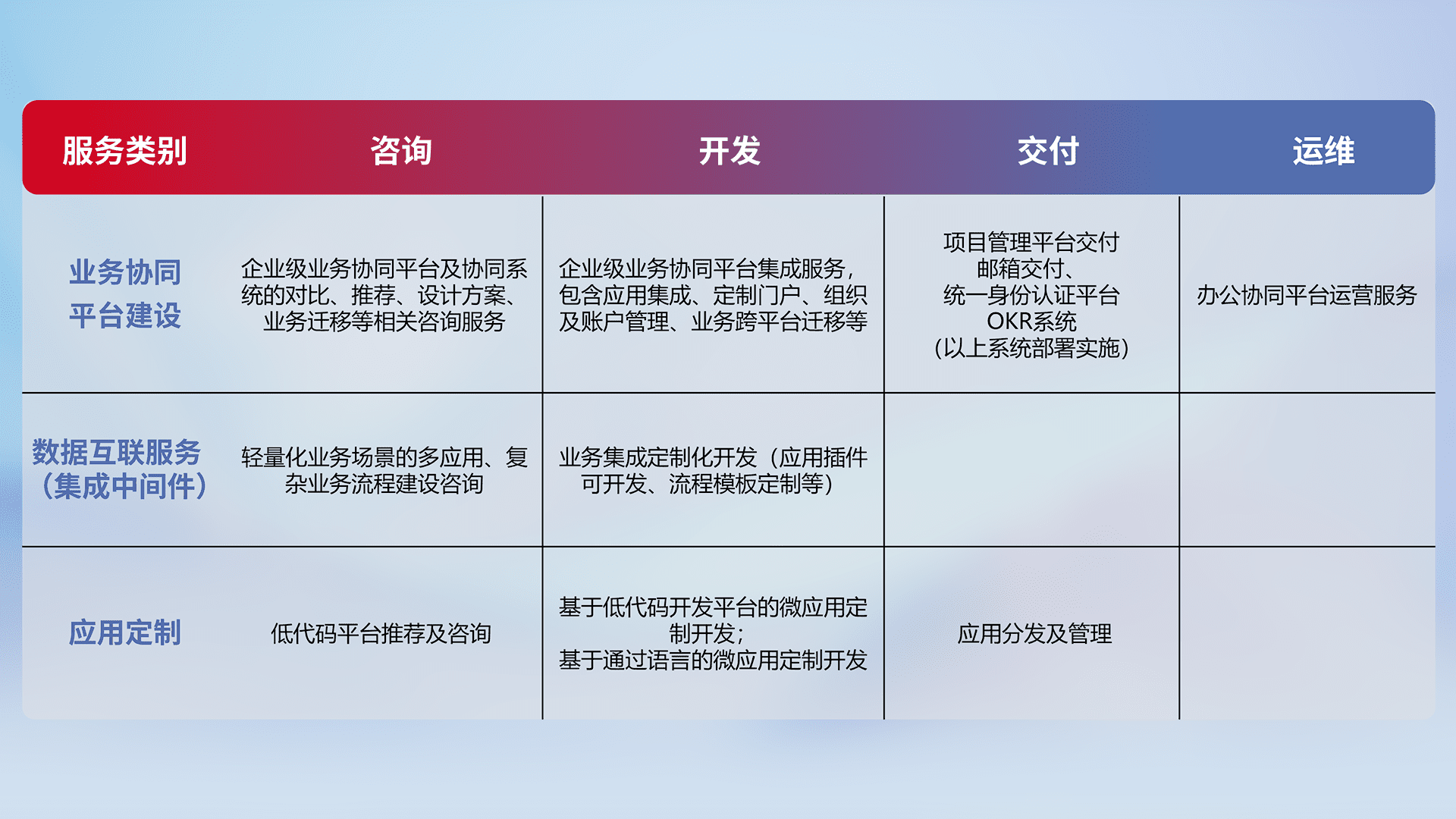 针对钉钉、、、、企微、、IDaas等平台级产品提供产品的规划、、、方案、、交付、、、、定制化开发等服务,,,实现如统一协同办公、、、、智能客户服务、、、、混合会议管理、、智能数据查询、、、等业务场景,,实现数字化转型。。。